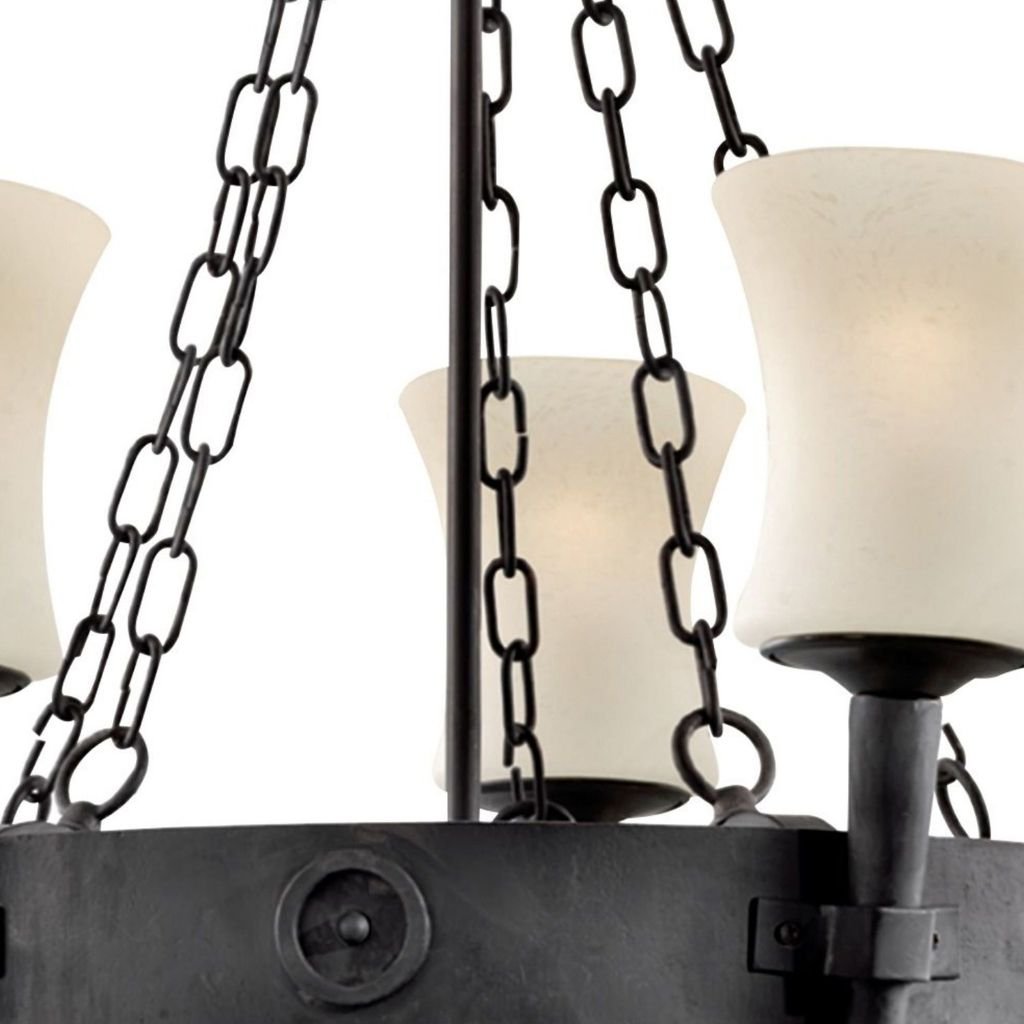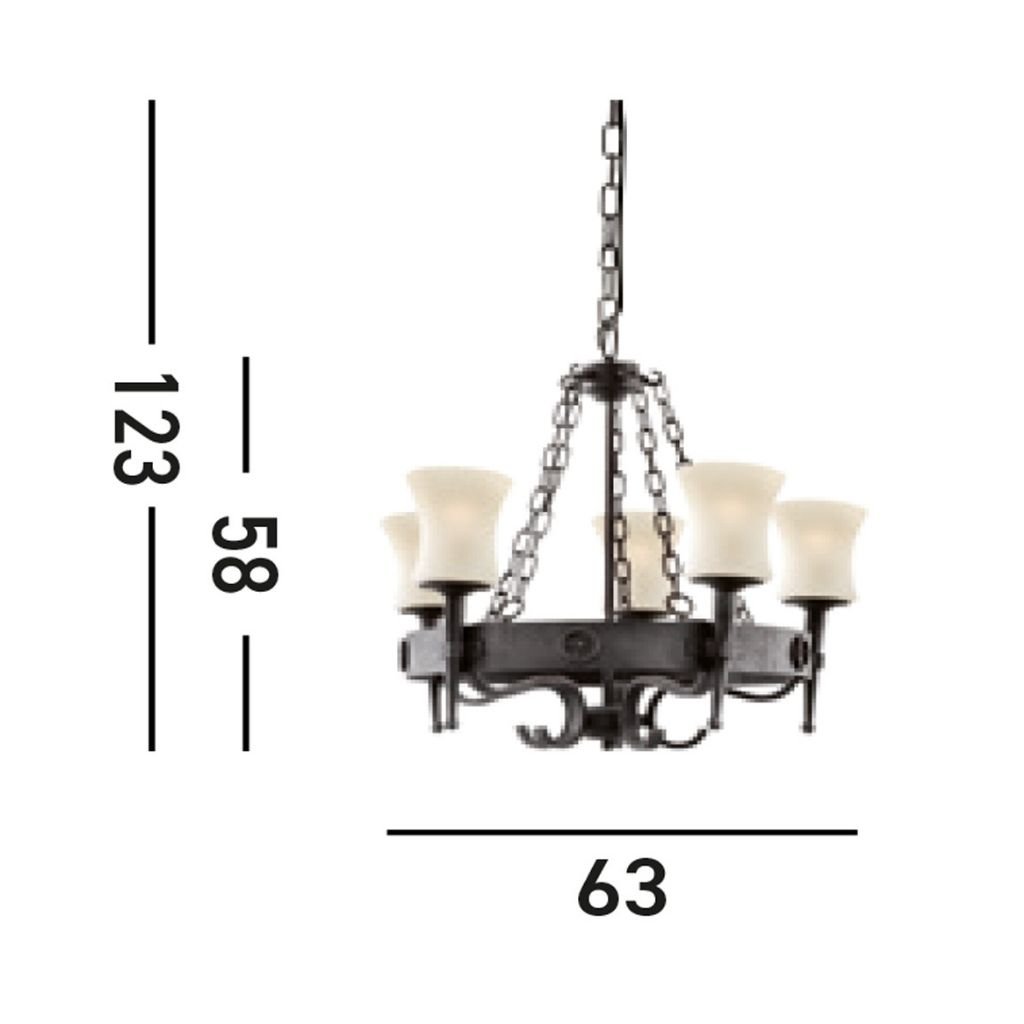Cartwheel 5Lt je závěsné svítidlo v tradičním anglickém stylu, které kombinuje černý kov s efektem kovaného železa a pískované skleněné stínidla. Díky výšce 580 mm, šířce 630 mm a nastavitelné délce závěsu až 1000 mm působí výrazně a elegantně.