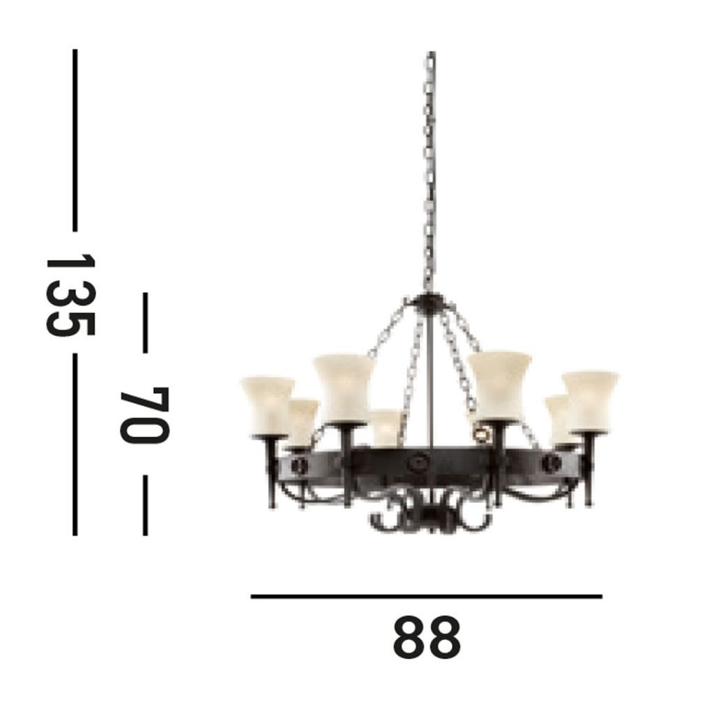 Závěsné svítidlo kovové, barva černá. Stínidlo je z skleněné. Od stropu výška 135 cm, průměr 88 cm. Svítidlo se připojuje na centrální vypínač. Patice pro světelný zdroj E27 na max. 8x60 W. Výrazný stylový prvek v interiéru. Žárovky balení neobsahuje. Vyberte žárovku LED s čirou baňkou ve tvaru svíčky.
