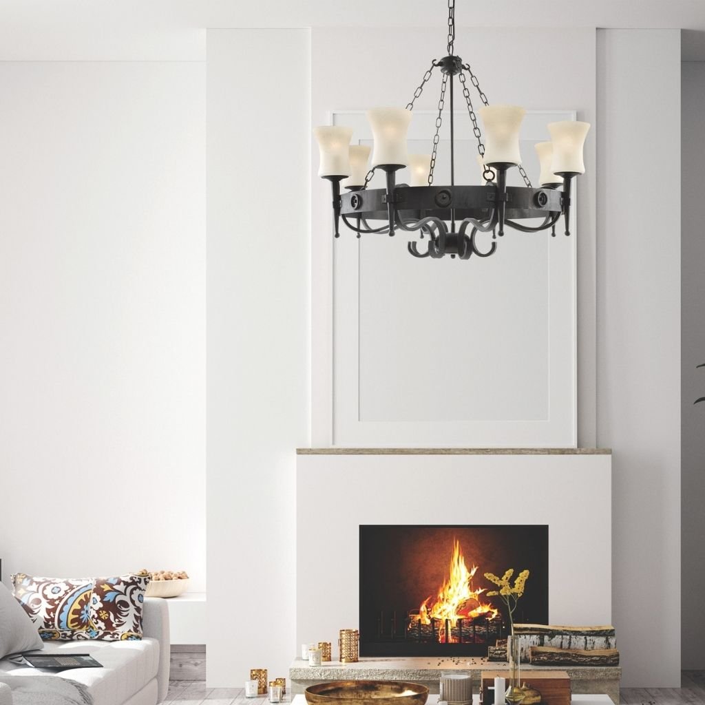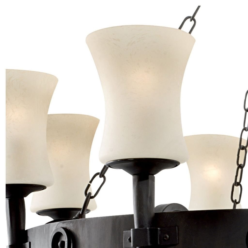 Cartwheel 8Lt je závěsné svítidlo v tradičním anglickém stylu, které kombinuje černý kov s efektem kovaného železa a pískované skleněné stínidla typu scavo.