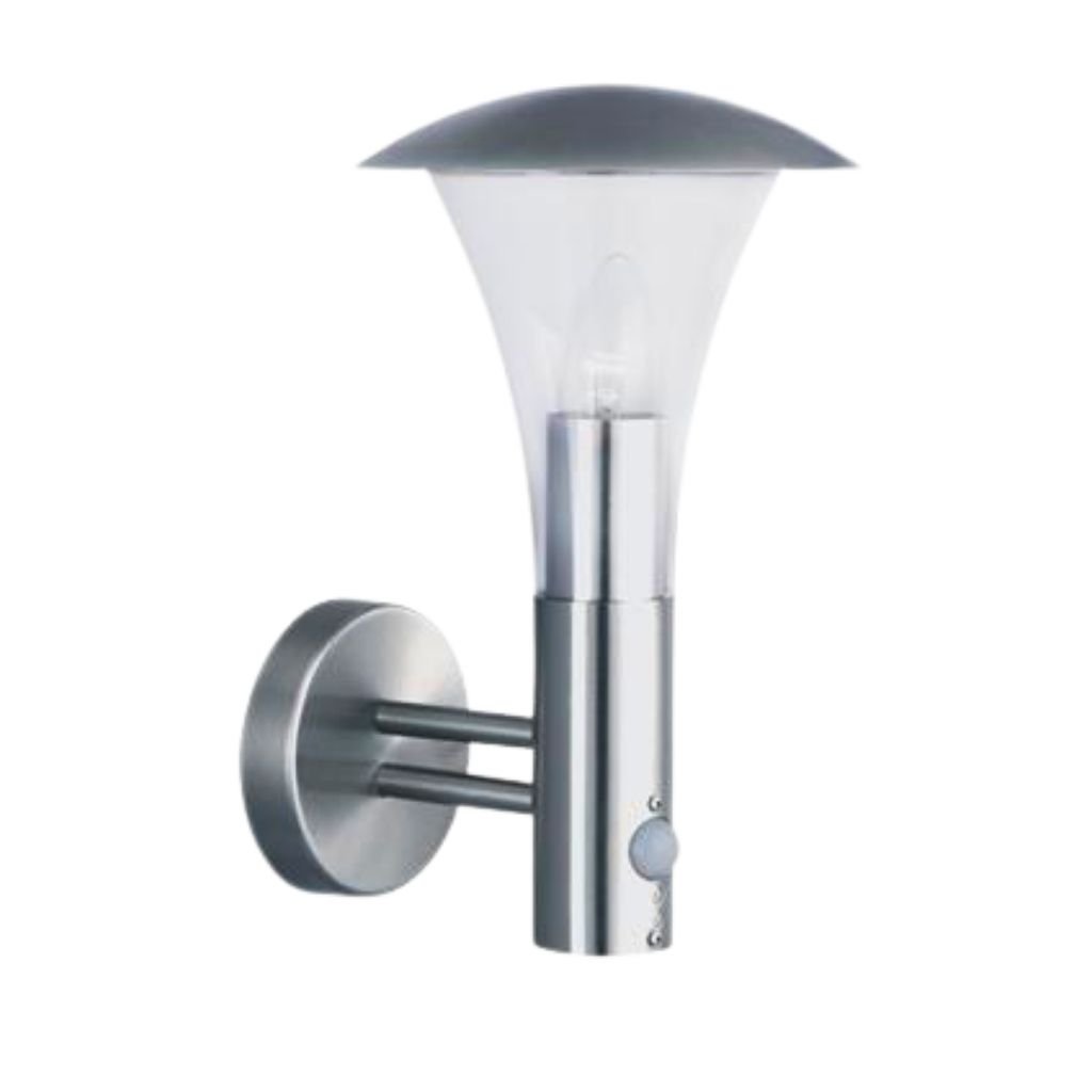 Senzor je pro snímání pohybu. Nastavení nejdete v návodu, je v příloze.Venkovní svítidlo na stěnu kov nerez a stínidlo čirý polykarbonát. Výška 28cm a průměr 18cm. Od stěny 22cm. Patice pro zdroj E27 na max. 1x60W. Krytí IP44 a senzor pohybu.