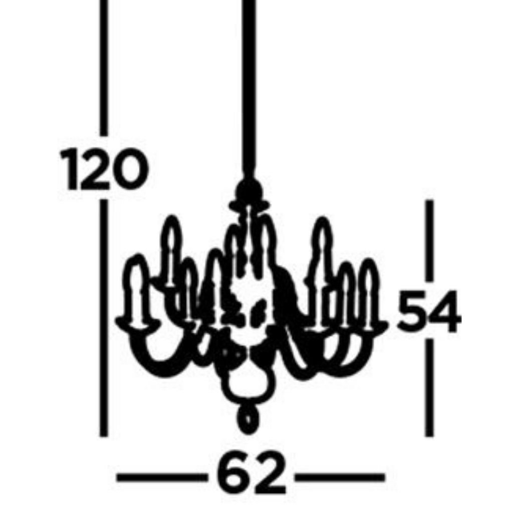 Od stropu výška 120 cm, průměr 62 cm. Svítidlo se připojuje na centrální vypínač. Patice pro světelný zdroj E14 na max. 12x60W. Design světelného zdroje ovlivňuje vzhled svítidla. Žárovky balení neobsahuje. Vyberte žárovku LED s čirou baňkou.