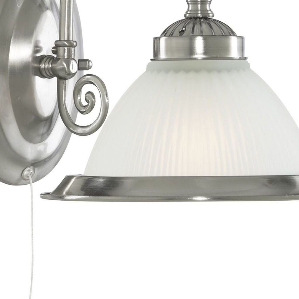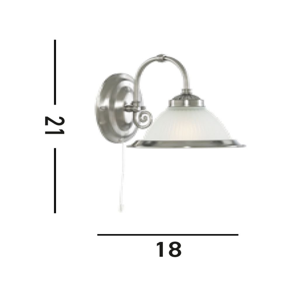 Od stěny je celkem 30 cm, šířka 18 cm. Má šňůrkový vypínač. Kovové komponenty matně stříbrného odstínu doplňuje stínidlo z žebrovaného skla. Lampa je krásným doplňkem a večer příjemně prozáří interiér. Žárovky balení neobsahuje. Vyberte žárovku LED ve tvaru malé kuličky.