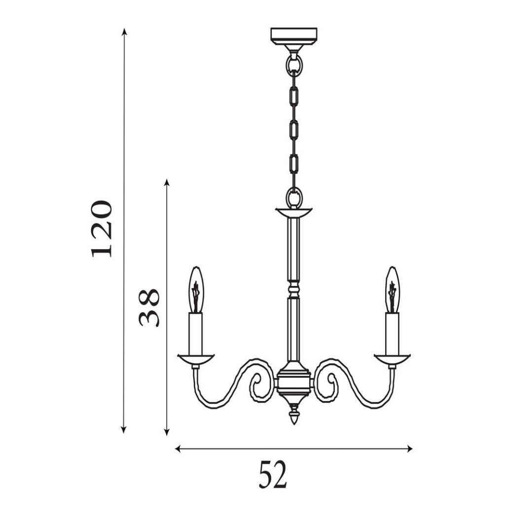 Závěsné svítidlo kovové, barva mosaz antik. Stínidlo nemá, tvoří ho žárovka. Od stropu výška 120 cm, průměr 52 cm. Svítidlo se připojuje na centrální vypínač. Patice pro světelný zdroj E14 na max. 5 × 60W.