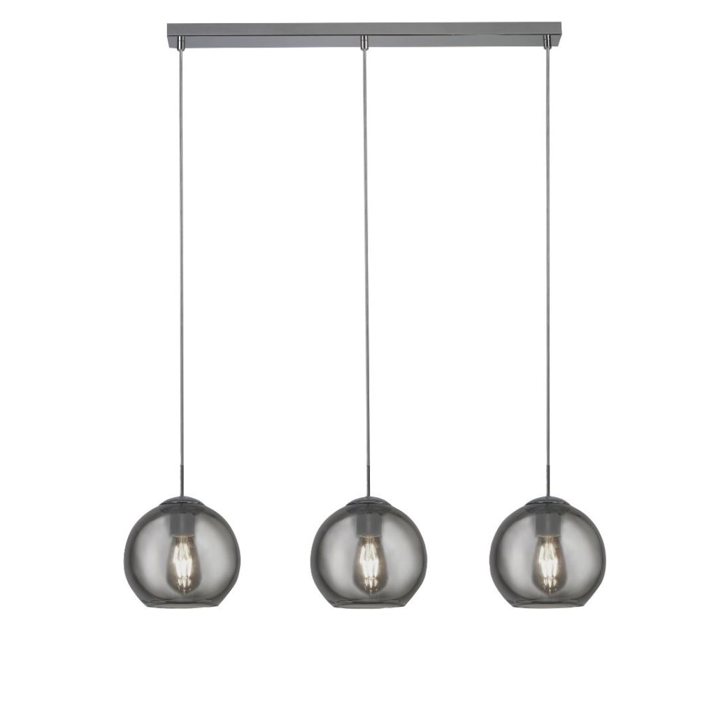 Závěsné svítidlo kovová, barva chrom. Stínidlo je z kouřového skla v dolní části otevřené. Od stropu výška 150cm, průměr 20cm. Svítidlo se připojuje na centrální vypínač. Patice pro světelný zdroj E27 na max. 3x60W. Výrazný designový prvek vinteriéru. Žárovky balení neobsahuje. Vyberte žárovku LED.