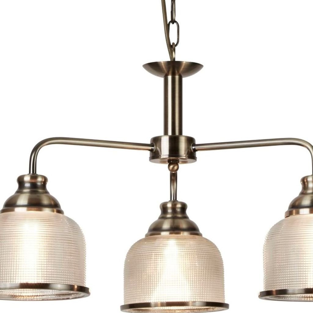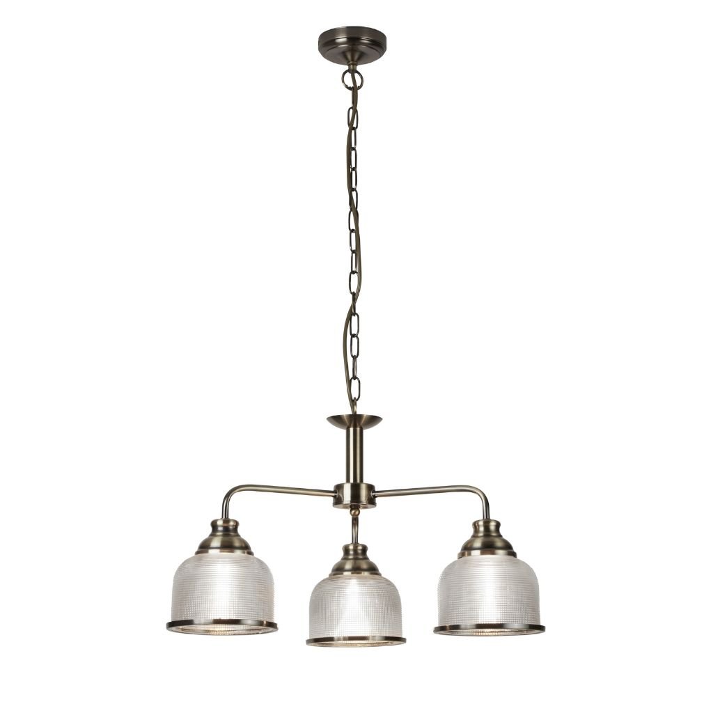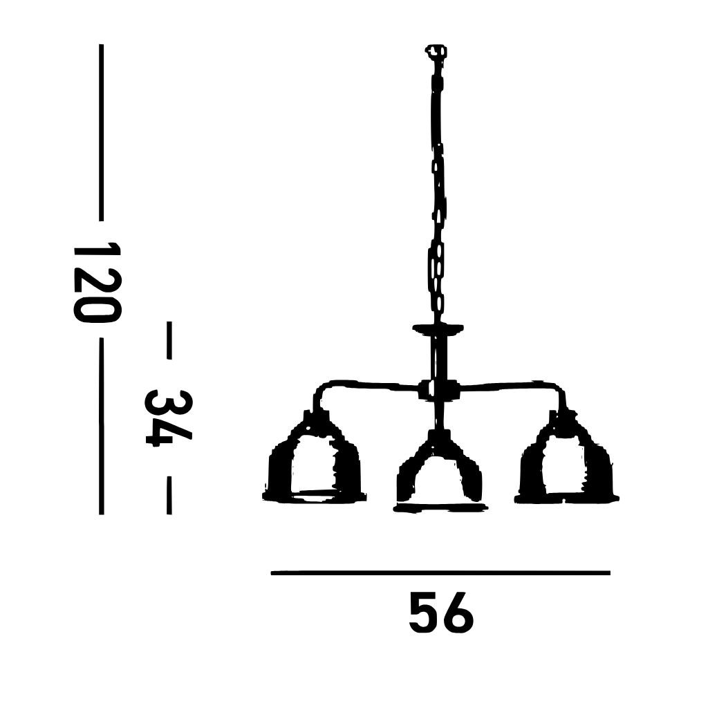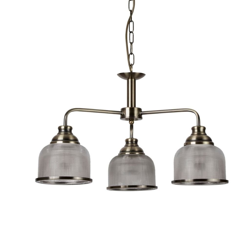 Závěsné svítidlo kovové povrchová úprava mosaz antik. Stínidlo je z čirého skla s drobnými vylisovanými pravidelnými vroubky. Od stropu výška 120 cm, průměr 56 cm, výška zavěšeného svítidla je 34 cm. Závěs se připojuje na centrální vypínač. Patice pro světelný zdroj E27 na max. 3 × 60W. Design světelného zdroje ovlivňuje vzhled svítidla, balení ho neobsahuje. Vyberte žárovku LED s čirou baňkou.