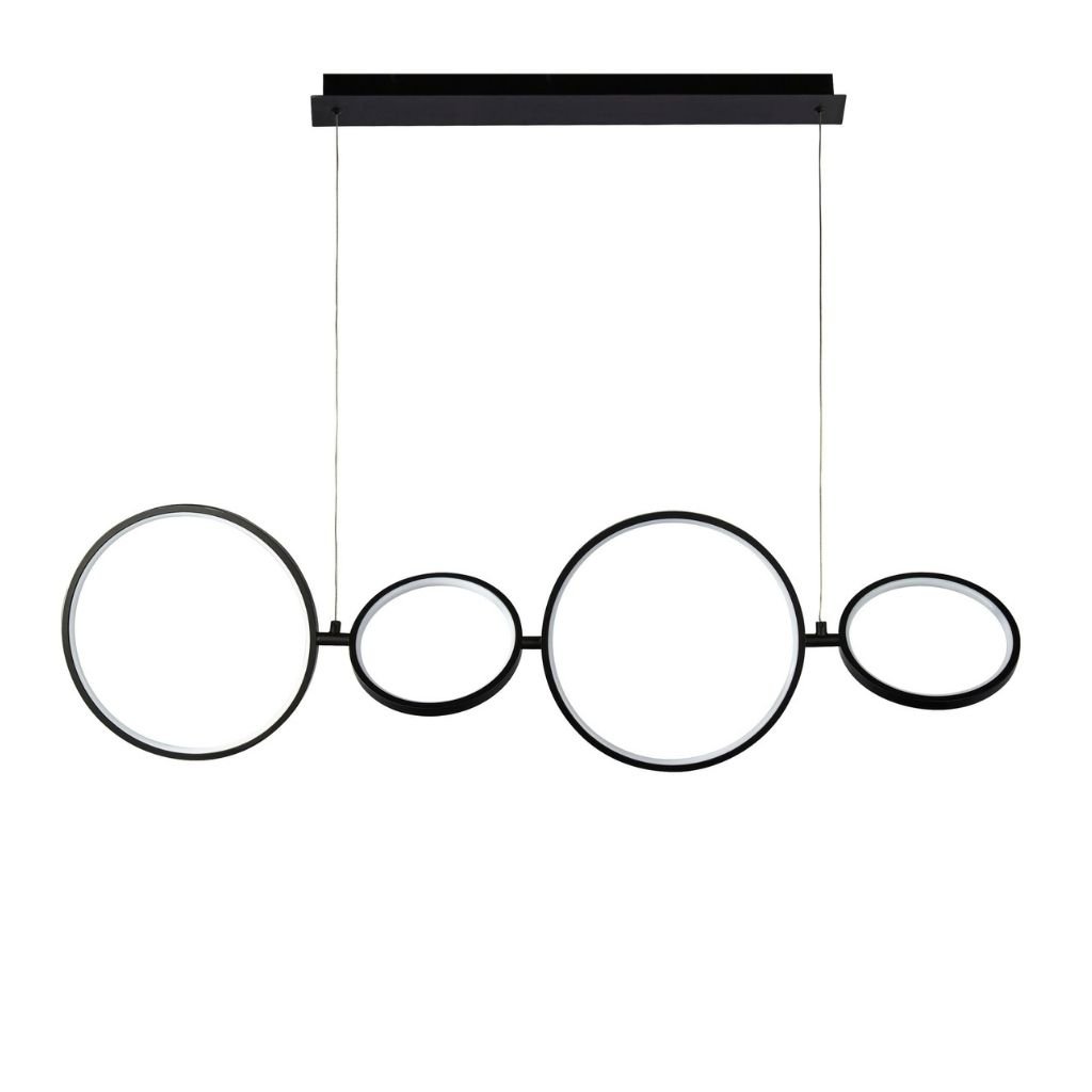 Závěsné svítidlo kovové, barva černá. Stínidlo je doplněno akrylovým difuzérem. Od stropu výška 150cm, průměr 7cm. Svítidlo se připojuje na centrální vypínač. Světelný zdroj je integrovaný LED na max. 1x40,7W. Výrazný designový prvek v interiéru. Integrovaný LED zdroj
