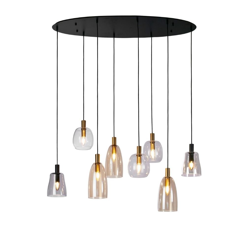 Přisazené svítidlo na strop v černé barvě, ze kterého visí na kabelech osm svítidel s různými stínidly ze skla. Patice pro zdroje jsou E14 na max. 8x60W. Délka základny je 109cm a délka od stropu je i s kabely 130cm. Žárovky balení neobsahuje. Vyberte žárovku LED s čirou baňkou.Velmi hravě působí stropní závěsné svítidlo s osmi různě dlouhými světly. Skleněná stínidla mají jemné odstíny a různé tvary. Svítidlo dostatečně prozáří velké prostory interiéru a i během dne jsou nepřehlédnutelným dekorativním doplňkem.