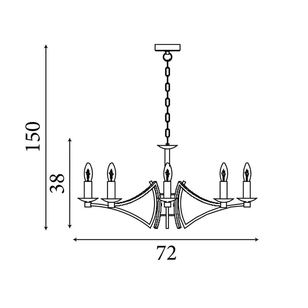Závěsné svítidlo kovové barva mosaz antik. Vhodný do větší místnost. Od stropu výška 150 cm, šířka 76 cm. Svítidlo se připojuje na centrální vypínač. Patice pro světelný zdroj E14 na max. 8 × 60W.
