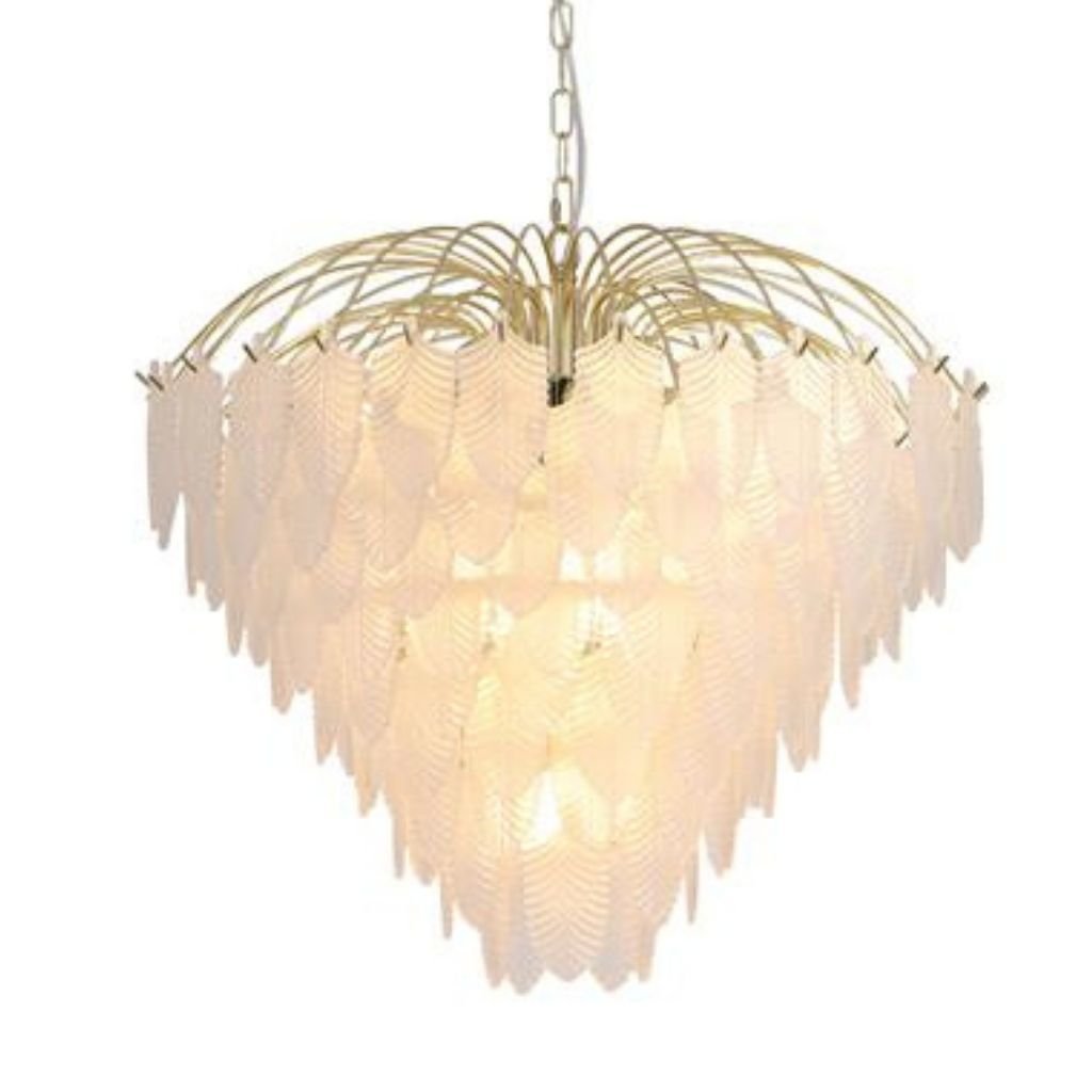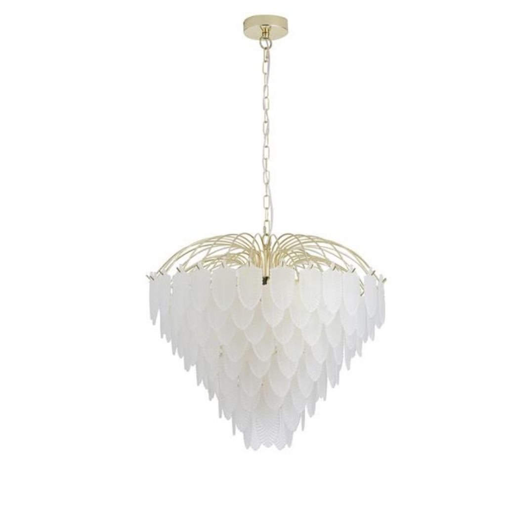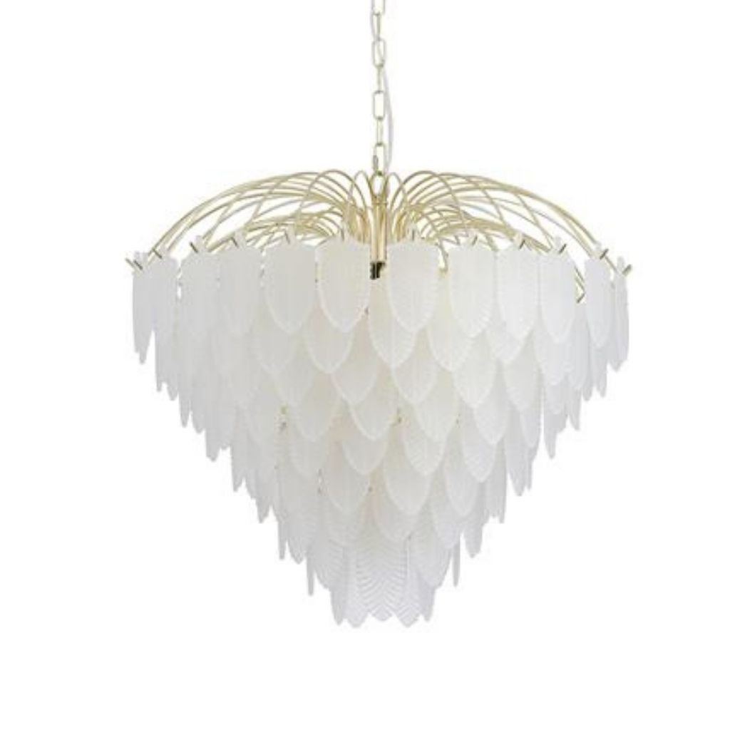 Závěsné svítidlo Feather v jemně kartáčované matné mosazi s matným sklem s výraznými motivy lístků. Od stropu celkem 158 cm a průměr je 63 cm, výška jen svítidla je 65 cm.