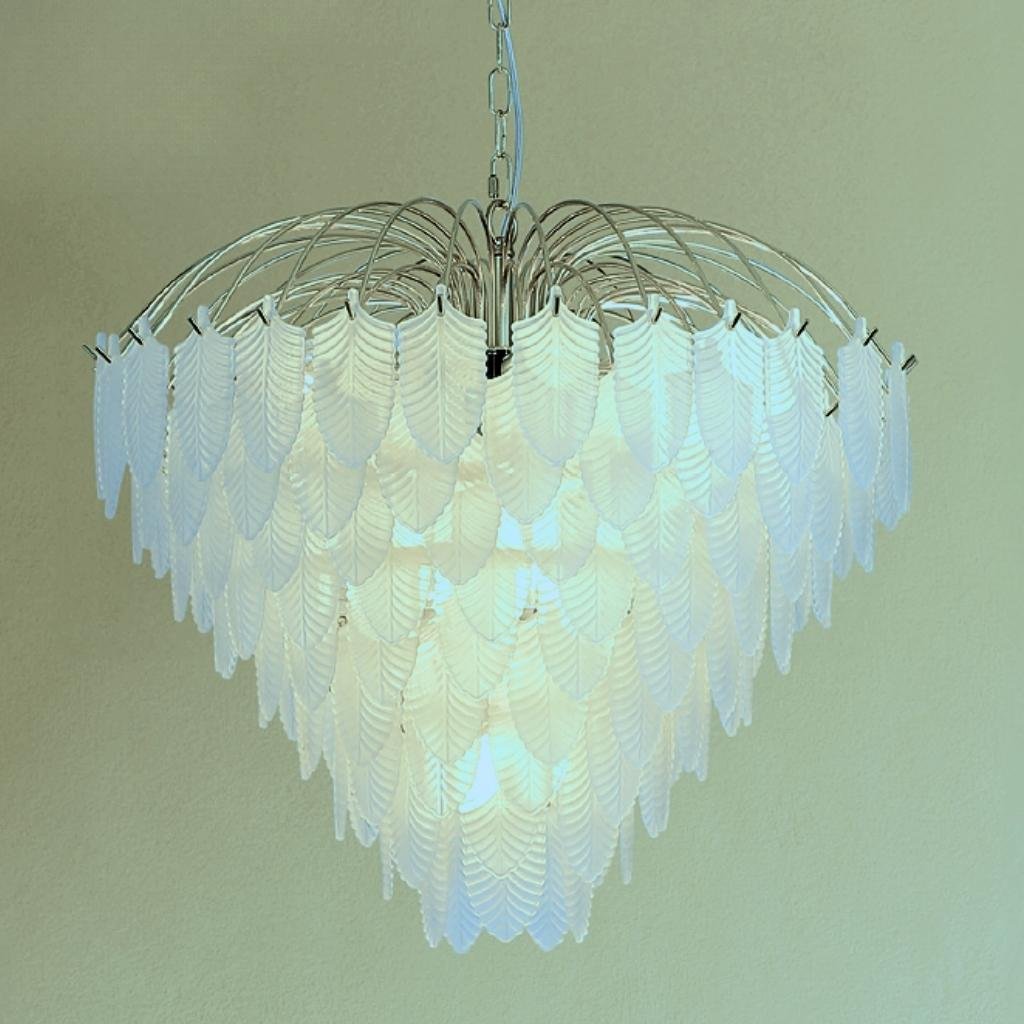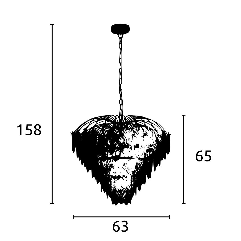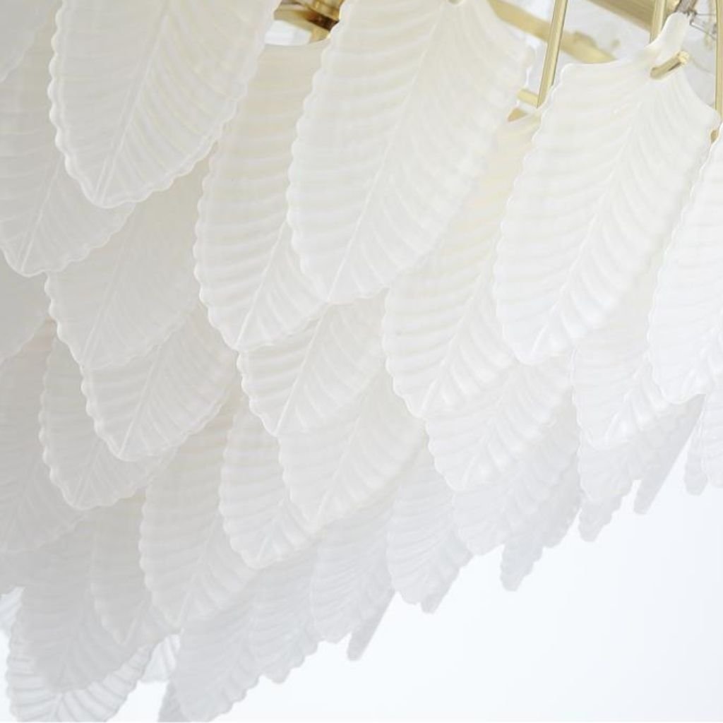 Závěsné svítidlo Feather v jemně kartáčované matné mosazi s matným sklem s výraznými motivy lístků. Od stropu celkem 158 cm a průměr je 63 cm, výška jen svítidla je 65 cm.
