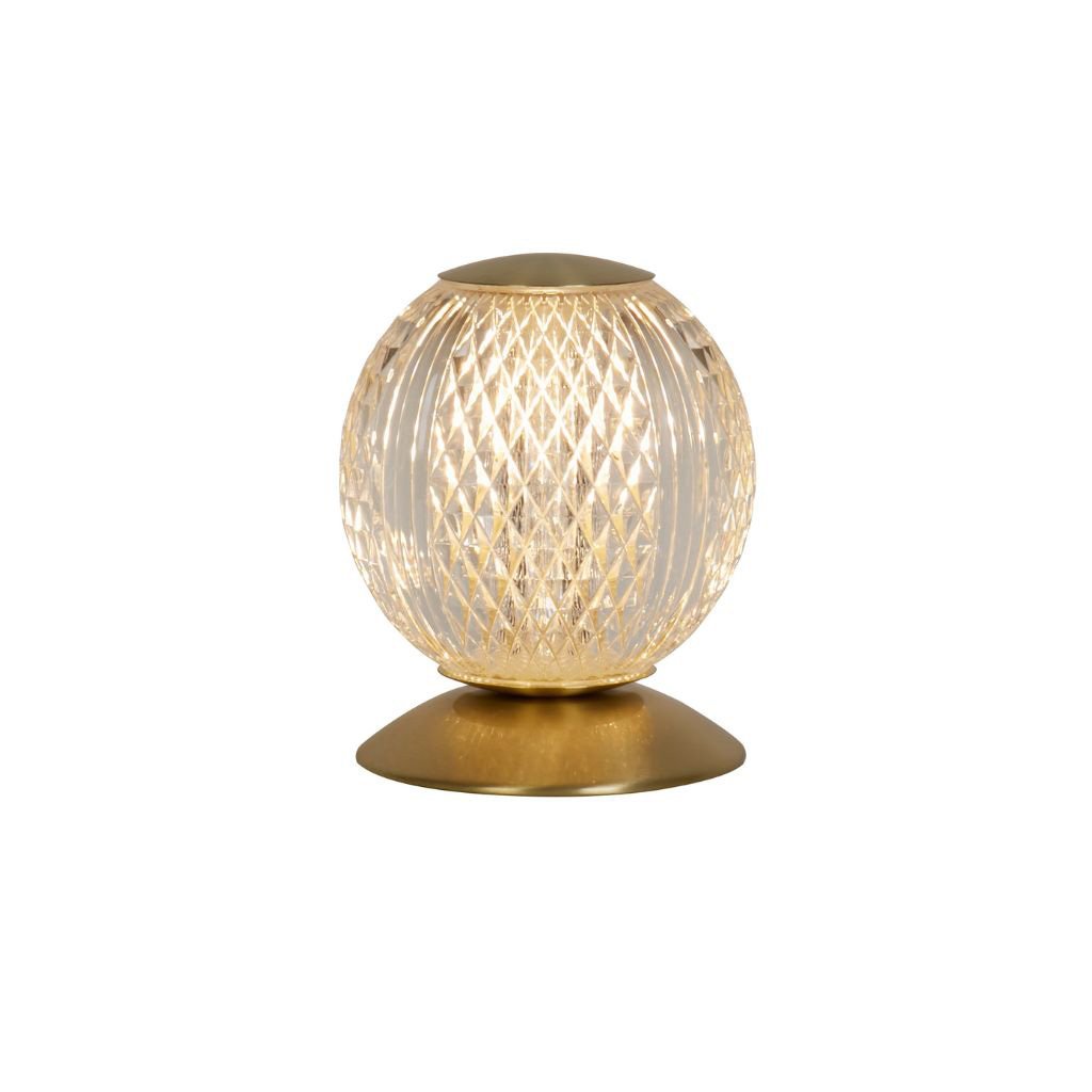 Stolní lampa kovová, povrchová úprava matná zlatá. Stínidlo je z akrylu. Výška 13cm, průměr 10cm. Má kolébkový vypínač na kabelu. Patice pro světelný zdroj G9 na max. 1x5W. Výrazný designový prvek v interiéru. Žárovky balení neobsahuje. Vyberte žárovku LED.