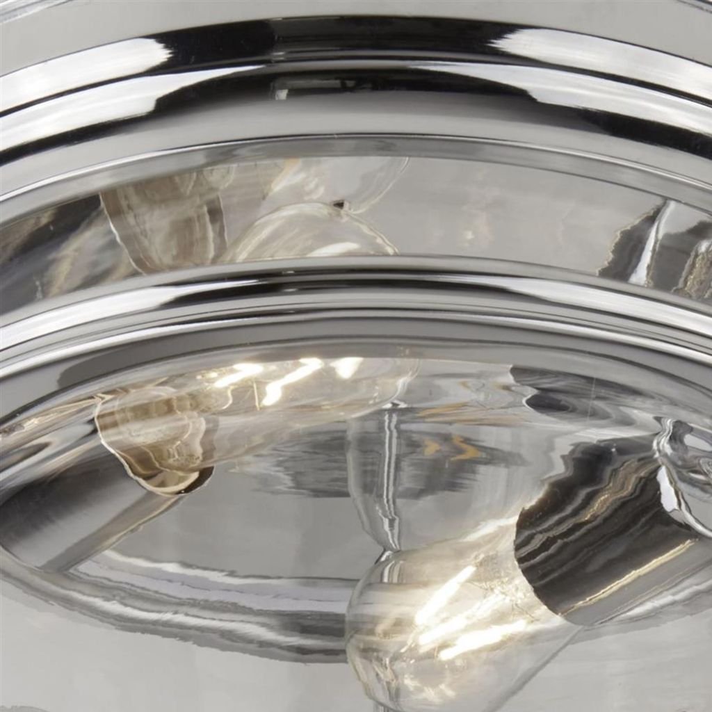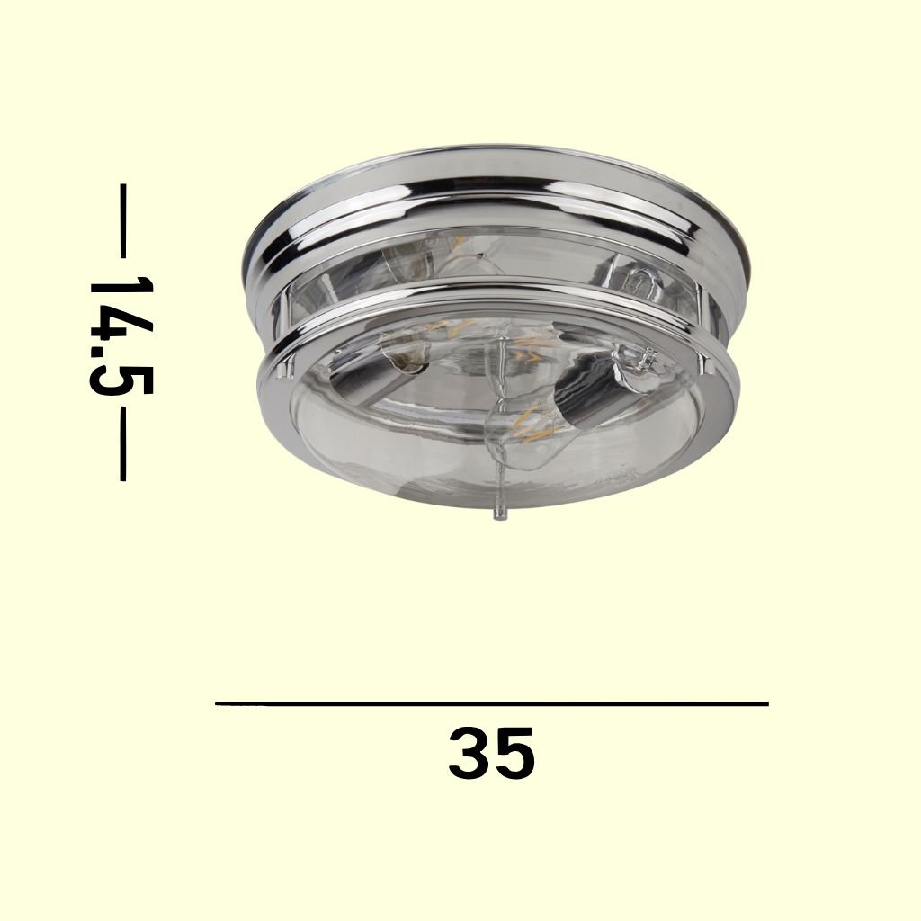 Stropní přisazené svítidlo z kovu a se sklem. Kov je v úpravě lesklý chrom a sklo je čiré. Výška je 15 cm a průměr je 35 cm. Krytí má IP44, je tedy vhodné i do koupelny. Patice E27 na max. 2 × 60 W. Žárovky balení neobsahuje. Vyberte žárovku typu LED.