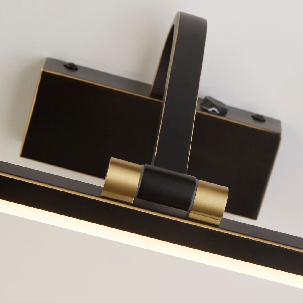 Obrazové nástěnné svítidlo kovové povrchová úprava černá a zlatá. Výška 11 cm, délka 70 cm. Svítidlo má vlastní kolébkový vypínač na montuře. Světelný zdroj LED je integrovaný na max. 1 × 16 W. Barva světla je 3000K a svítivost 1642 lumenů. Výrobce je Searchlight z Anglie.