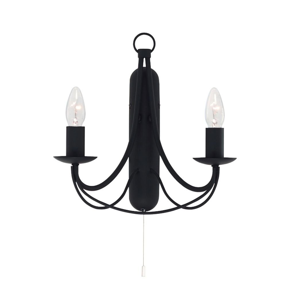 Nástěnné svítidlo se dvěma rameny a zdobením v černé barvě. Výška 31cm a šířka 31cm. Od stěny 14cm. Patice pro zdroj E14 na max. 2x60W. Žárovky balení neobsahuje. Vyberte žárovku LED ve tvaru svíčky