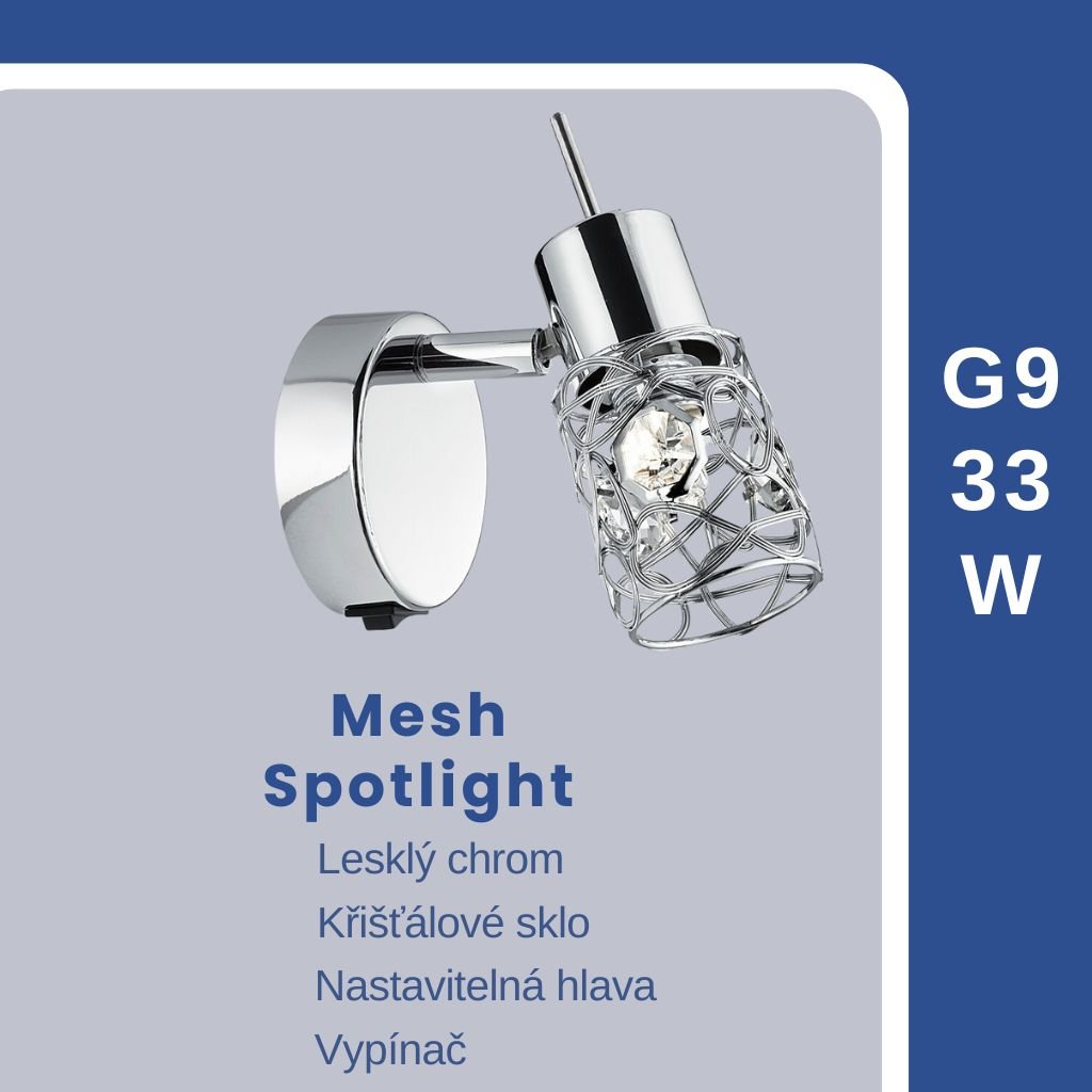 Bodovka z kovu. Kov je v úpravě lesklý chrom. Má vypínač kolébkový na základně svítidla. Patice G9 na max. 33 W. Výška je 14 cm a průměr je 8 cm. Žárovku balení neobsahuje. Vyberte žárovku typu LED.