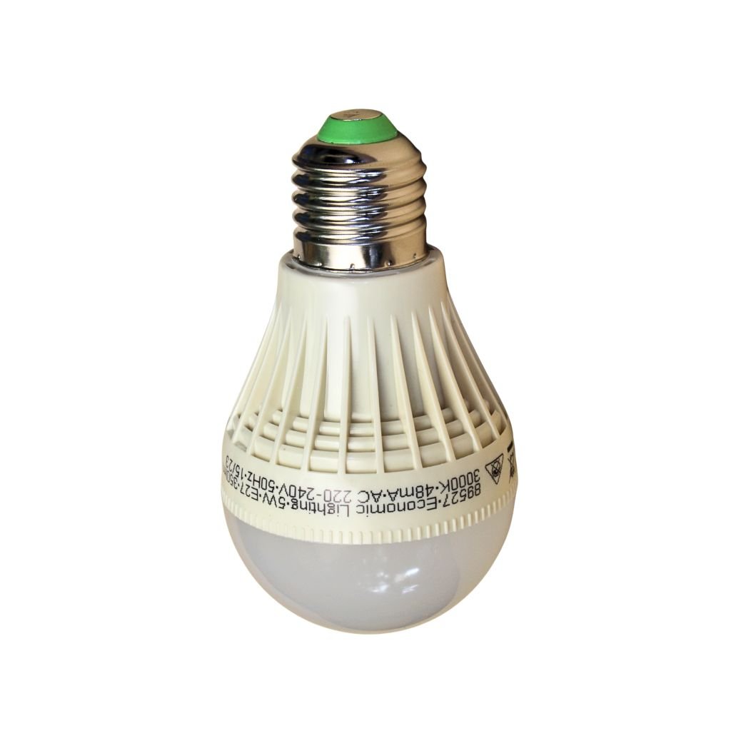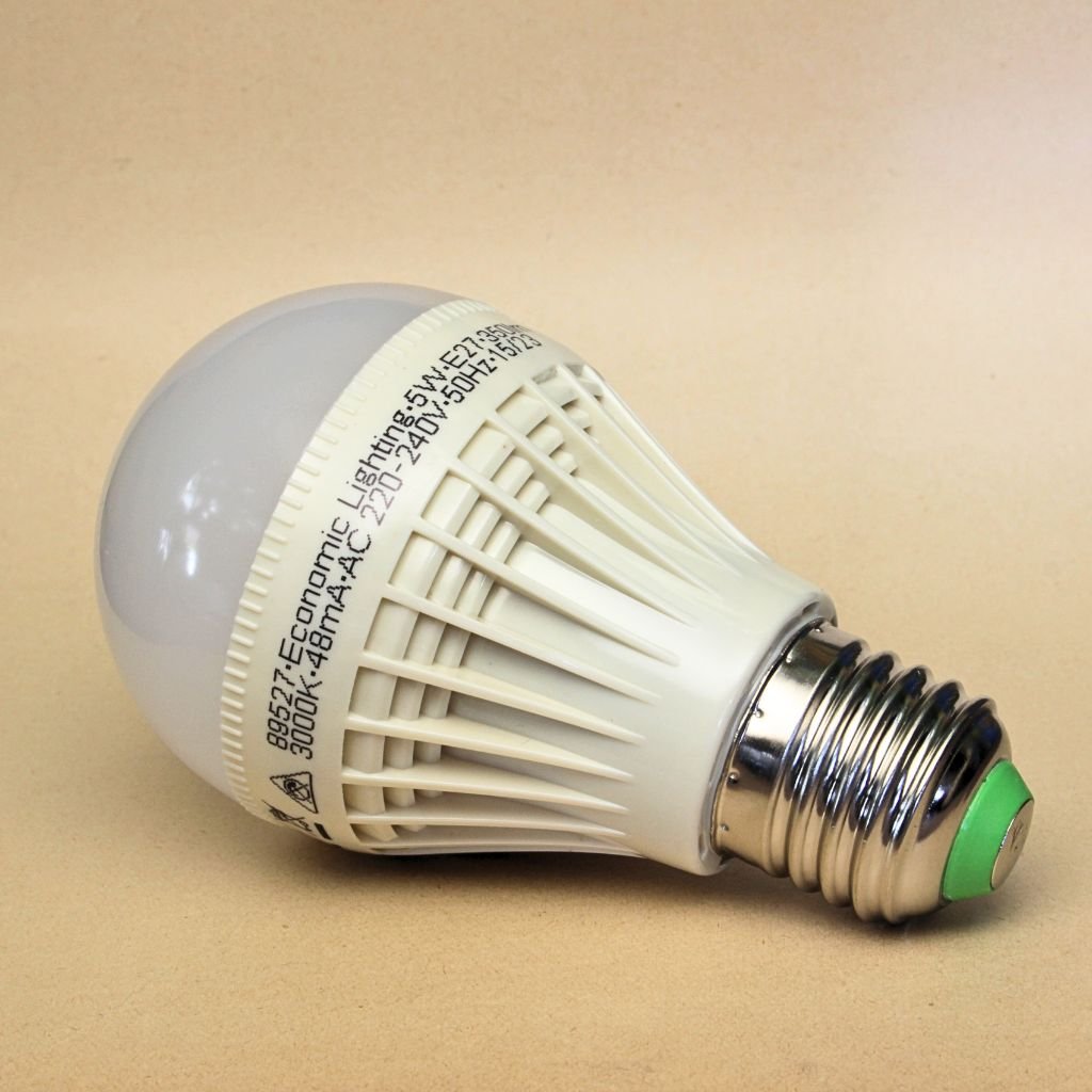 Žárovka plastová bílá CRI 80 Ra patice E27. Má životnost cca 20 tis. spínacích cyklů. Příkon 5 W, stmívatelná není. Teplota chromatičnosti je 3000K a světelný tok 350 lm.