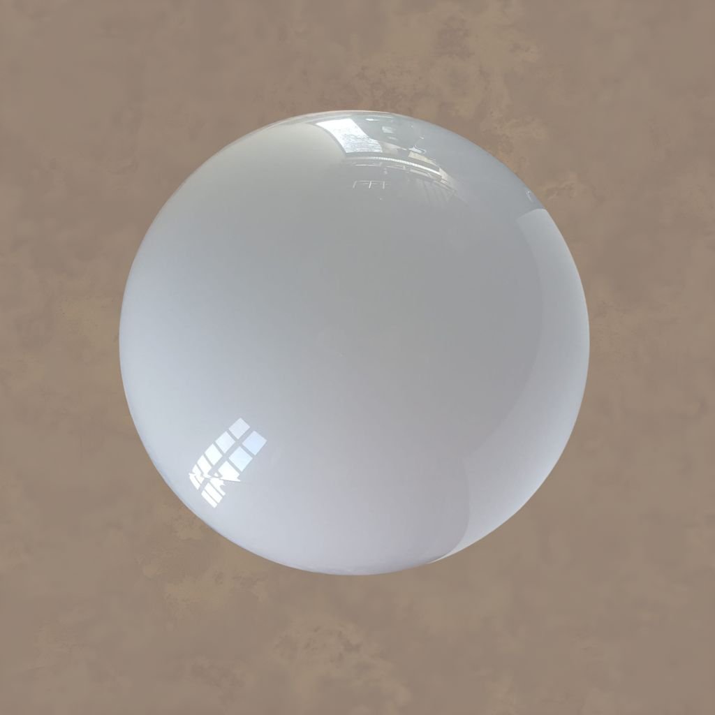 Skleněná koule o průměru 25cm a v horní části je otvor o průměru 9cm. Skleněná koule pravidelného tvaru o průměru 25cm, dole je uzavřená. V horní části je otvor o průměru 9cm. Koule je v dolní části uzavřena, tedy tu není žádý otvor.