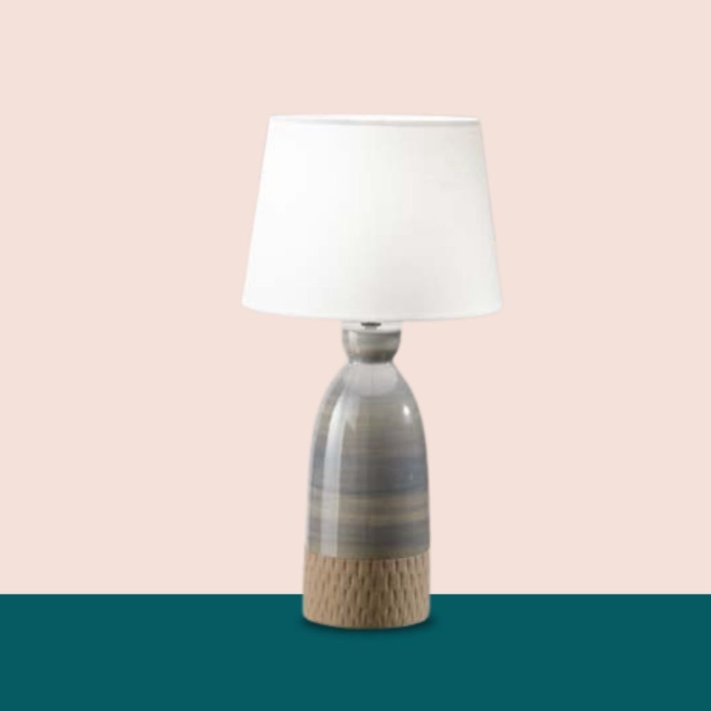 Keramická stolní lampa zemitých barev od šedé až po hnědou. Krásné přírodní odstíny. Stínidlo je textilní v bílém odstínu. Patice pro žárovku je E27 na max. 1x60W. Výška lampy je 49cm a průměr stínidla 25cm. Vypínač najdete na kabelu. Žárovky balení neobsahuje. Vyberte žárovku LED ve tvaru malé kuličky..