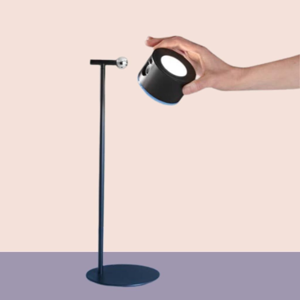 Stolní lampa z kovu, na noze je magnetem umístěný světelný váleček, který lze uchytit i a stěnu jako nástěnné svítidlo. Je nabíjecí, nabíjí se 3,5-4,5 hodiny a svítí 4-18hodin podle použité intenzity svícení.